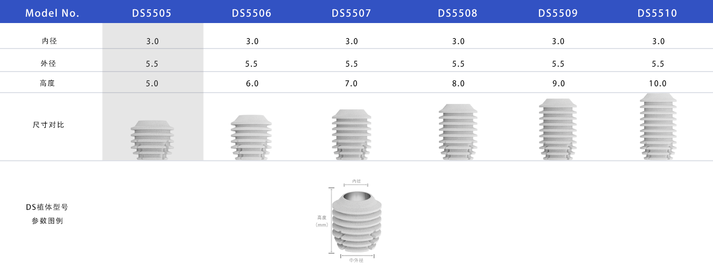 DS-серия: подходит для однокорневой или многокорневой реставрации при недостаточной плотности костной ткани. Например, модель DS4006 (диаметр 4,0 мм) подходит для случаев ограниченной ширины кости в области задних зубов.